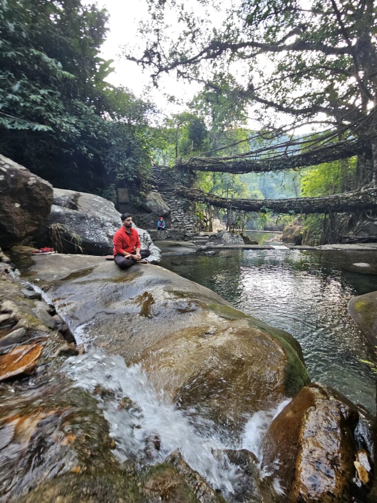 Day 4 commenced with a delightful breakfast after which we left for Tyrna – the starting point for our trek to the mesmerizing Rainbow Waterfalls. The descent of 3500 steps into the valley was both scenic and invigorating. Our trek led us first to the bustling Double Decker Root Bridge, crowded with tourists by noon. Undeterred, we continued our journey to Rainbow Waterfalls, reaching just in time to witness the enchanting rainbow formation around 2 PM.