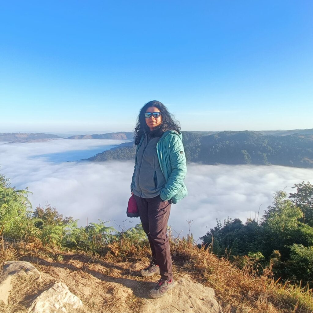 Perched on the hill, we patiently waited for an hour in the windy, chilly morning. As time unfolded, the sky transformed into a captivating palette of purple, inky blue, and hints of red. Gradually, we became aware that we were enveloped by clouds on all sides, creating a truly mesmerizing panorama. The ethereal beauty of the scene was beyond words, marking the dawn with a touch of magic.